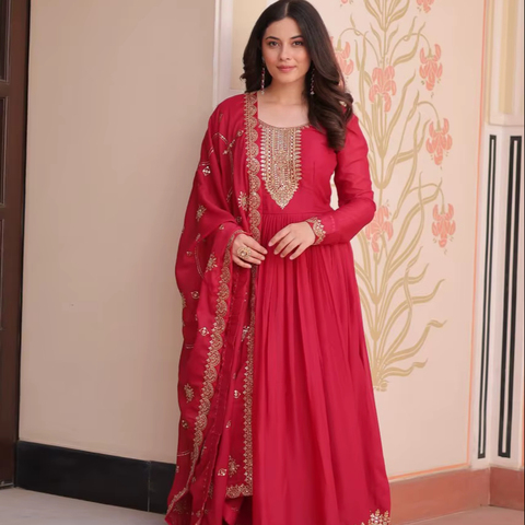 فستان نسائي جميل مع دوباتا ثقيل طويل هندي وظيفة كورتي حرير باكستاني للبالغين